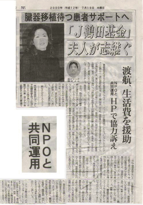 ジャンボ鶴田 平成12年1月、母子感染B型肝炎のために実兄からの肝臓移植を行う予定でしたが,残念ながら不適合のため断念。他国での移植を待ちました。その後フィリピンでの手術が可能となり,5月12日移植手術を受けましたが、残念ながら大量出血のため,最期を迎えることとなりました。 生前、ジャンボ鶴田氏ご本人は,自国に高医療レベルがありながら海外でしか命をつなぐことができないという悲惨な現実を何とかしたい,との思いで様々な活動をされ,「ジャンボ鶴田基金」を設立されました。 鶴田夫人からお話をいただき、日本移植支援協会は同じ目的をもった団体として,共に日本での移植推進に力を入れていくことを確認いたしました。 |