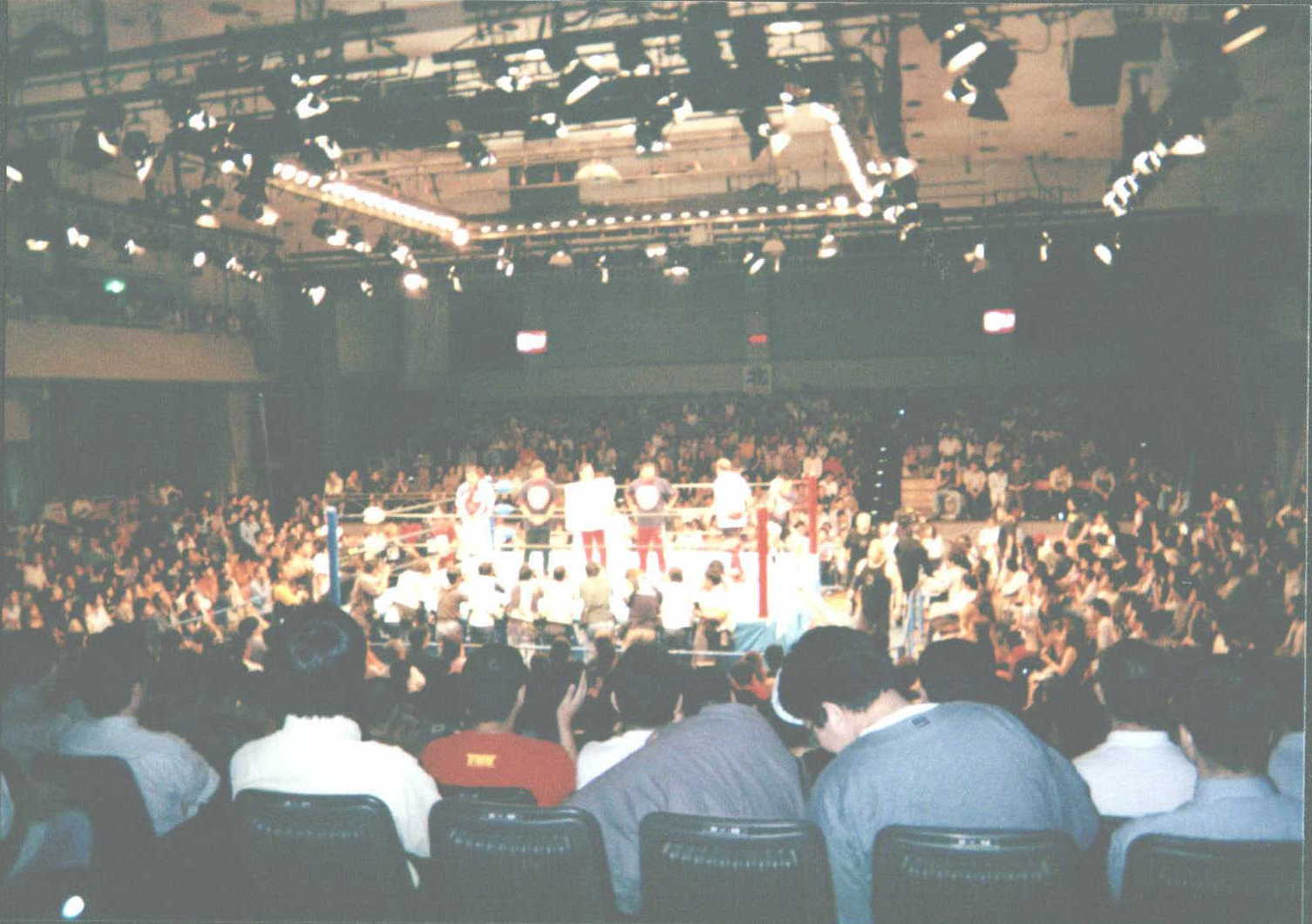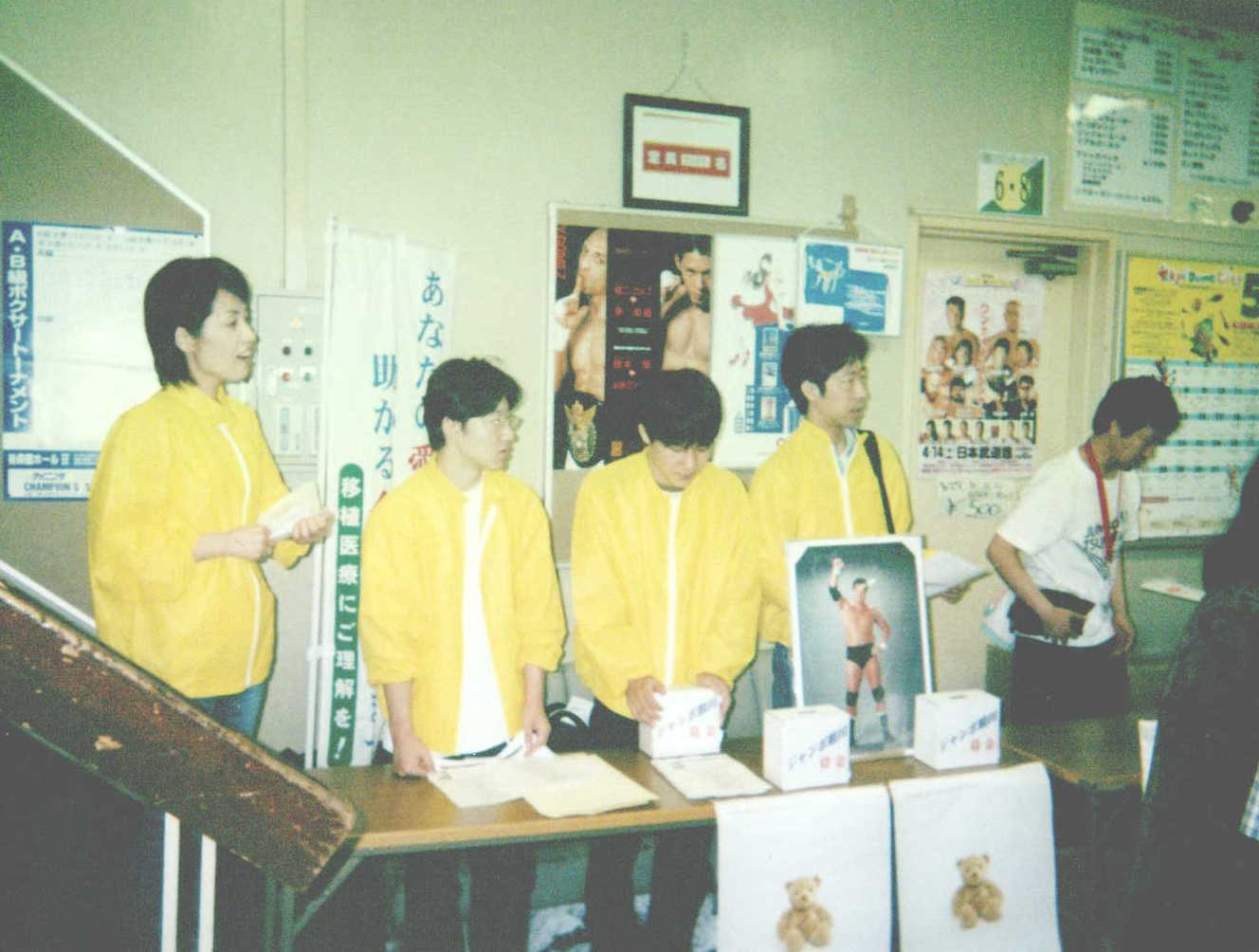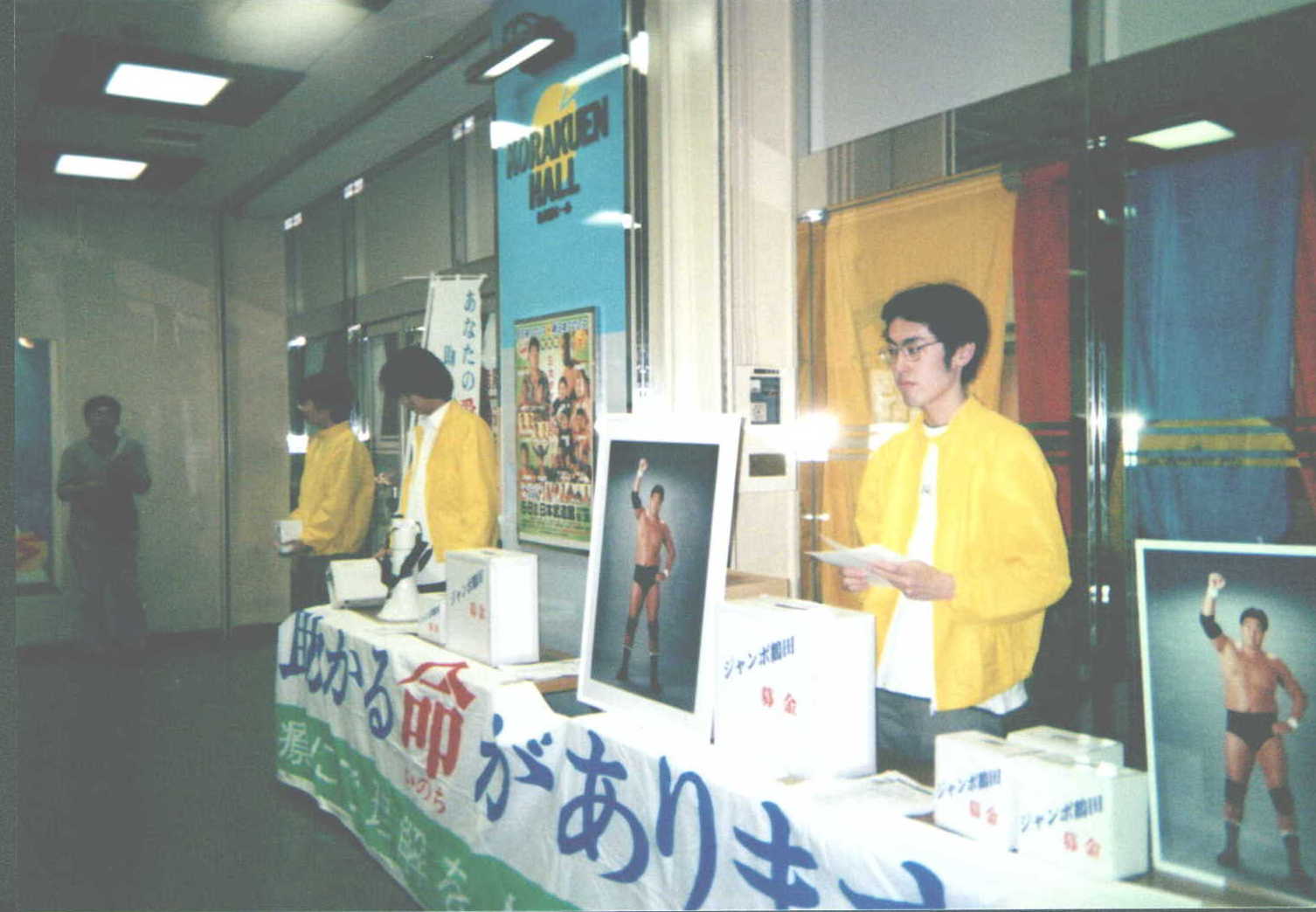 | 全日本プロレスさんの御協力により後楽園ホールでの「ジャンボ鶴田一周忌追悼興行」にジャンボ鶴田基金の募金活動を行わせて頂きました。当日は明治大学のボランティアの方がお手伝い下さりました。また、馬場元子さんを初めとする全日本プロレスの方が色々とお手伝いくださいました。この場を借りて御礼申し上げます。 募金の総額は\123,364となりました。皆様の善意をお預かり致しました。ありがとうございました。 |