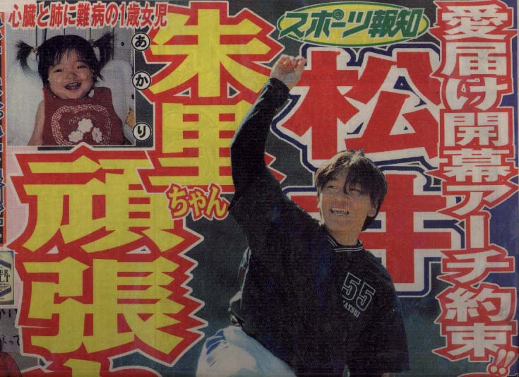 斉野あかりちゃんは心臓と肺の同時移植しか助かる方法はないと言われ、アメリカに渡りましたが、肝臓にも病気が見つかり残念ながら移植を断念。日本に戻り、その翌日の2000年2月24日、1才7ヶ月という短い命でこの世を去ってしまいました。 松井選手はあかりちゃんの渡米に際し、激励のアーチを約束し、また募金にも協力して下さいました。 |