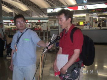 関西空港記者会見をうけるしょうごくんのお父さん(右)