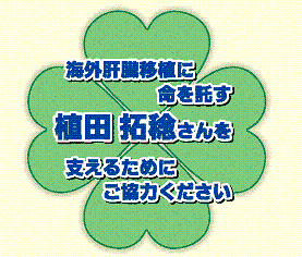 2004/10/12(マイアミ時間)午後1時50分(日本時間13日午前2時50分)に無事移植手術が成功しました。 2005/3/9 無事帰国しました。多くの皆様に、暖かいご協力、励ましを頂き、深く感謝申し上げます。 「植田拓稔君を支える会」のホームページはこちら |